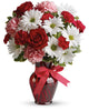 - The charming bouquet includes white daisy spray chrysanthemums, pink carnations, red miniature carnations and red roses accented with fresh greenery in a stylish red vase.