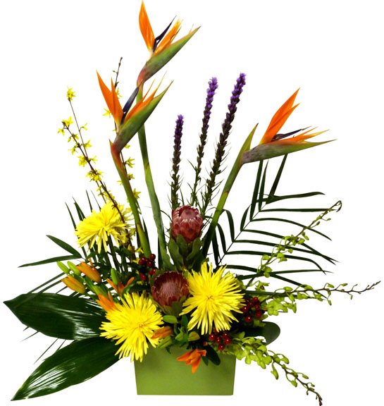 A lovely tropical centrepiece with bird of paradise, latice, anastasia, and greens