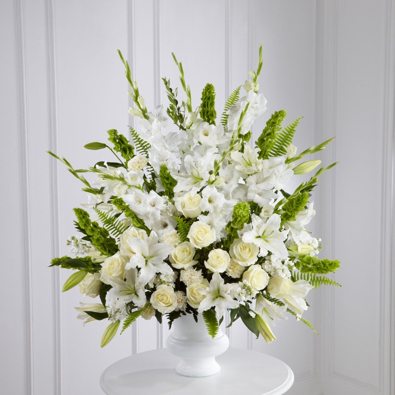 The Morning Stars™ Arrangement is a brilliant expression of peace and soft serenity. White roses, carnations, gladiolus, stock, and Oriental lilies are accented with the bright green stems of Bells of Ireland and a gorgeous assortment of lush greens, while seated in a white designer plastic urn to create a beautiful way to honor the life of the deceased.