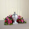 Create a beautiful and reverential setting for an urn containing your loved one’s cremated remains with an arc of lovely spring-hued blossoms that doubles as a candleholder. This respectful display gently draws the focus on a tabletop or altar for a memorial service, funeral or wake. The arrangement is hand-fashioned by a local artisan florist of pink and lavender roses, hot pink carnations and purple statice and holds white taper candles . It has a flat bottom for stability.