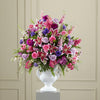 Extravagant, beautiful and comforting, this generously scaled arrangement eloquently expresses your sympathy with an abundance of love and a profound manifestation of loss. Handcrafted by a local artisan florist, it combines a colorful profusion of lavender and hot pink roses, pink statice, purple lisianthus and dahlias, Stargazer lilies and lavender alstroemeria enhanced with a rich and exotic variety of lush greenery in a classically-inspired white ceramic urn. It’s an extraordinary choic