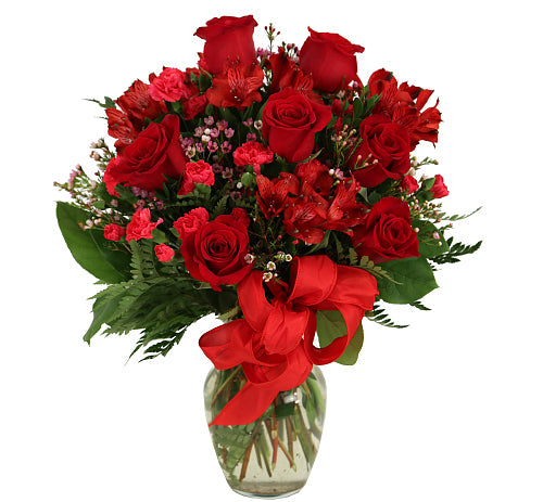 Red roses are hand-arranged with red alstroemeria, magenta carnations, delicate pink waxflower and a large red bow.