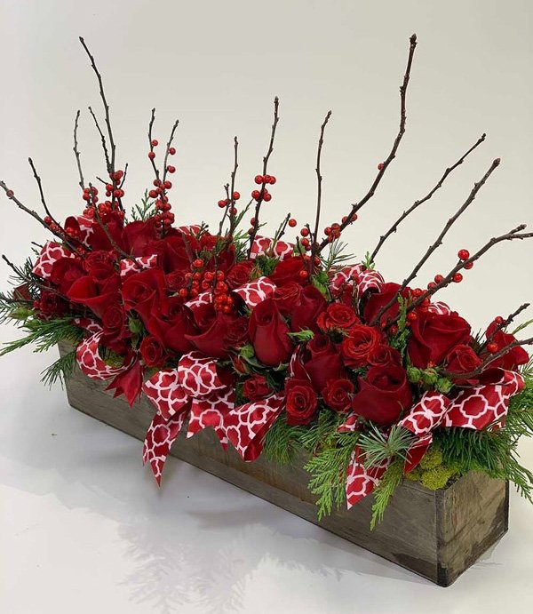 Festive arrangement to cheer up the young at heart set in a rustic box with winter greens, festive ribbon, red roses and ilex berries.