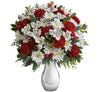 Brighten any winter's day with this festive array of crimson carnations and winter white alstroemeria. Hand-delivered in a shimmering silver vase, it's a fresh, fabulous way to send your holiday best. Red carnations, white alstroemeria, and white cushion chrysanthemums are arranged with variegated holly, flat cedar, noble fir, and red berries.