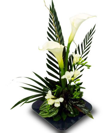 A beautiful arrangement in a low container featuring Calla Lilies, Freesia, exotic greens and Curly Willow