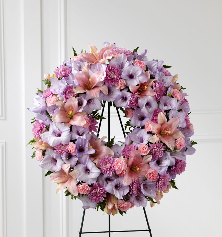 The Sleep in Peace™ Wreath is a soft expression of sympathy that will bring comfort and offer hope during the final farewell. Lavender gladiolus, pink Asiatic lilies, lavender chrysanthemums, pink mini carnations and lush greens are beautifully arranged in the form of a wreath for a sweet and colorful look. Displayed on a wire easel, this wreath is a lovely way to honor the life of the deceased.