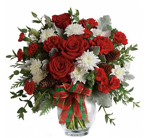 The splendor of the season is beautifully captured in this traditional holiday arrangement. The mix of blossoms, holiday greens, and textures is a brilliant way to say Merry Christmas!