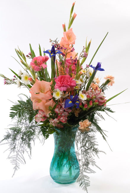 This beautiful vase contains Carnations, Alstroemeria, Irises, Gladiolas and greens