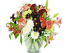 This vase arrangement combines Daisies, Alstromeria, Lilies, filler, Roses, greens and Carnations