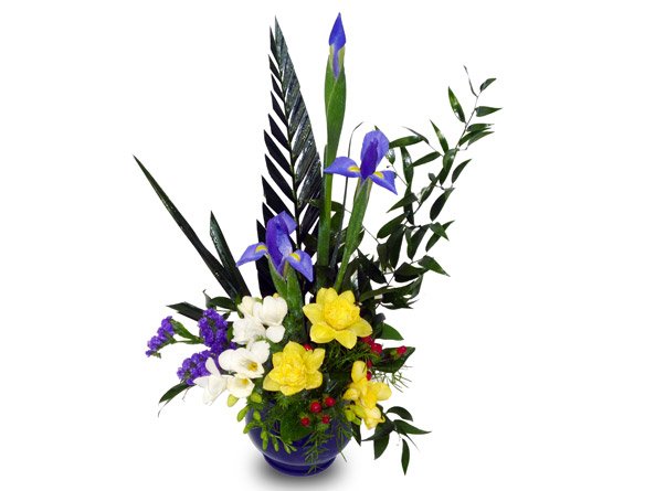 This contemporary design features Freesia, Berries, Statice, Daffodils, Irises, filler and greens