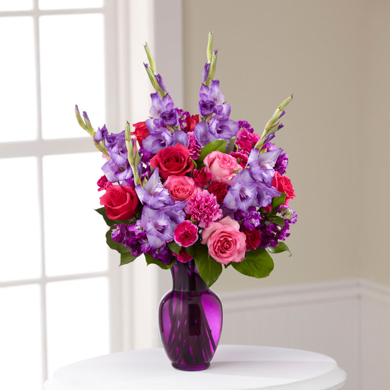 Celebrate a life well-lived with this colorful floral tribute. Handcrafted by a local artisan florist, this arrangement is just right for delivering your message of sympathy at a wake, funeral or to comfort grieving family or friends at home. A vibrant composition of mixed flowers in spring and summer colors combines pink roses and carnations, purple stock and gladiolus arranged in a purple glass vase.