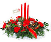 An assortment of red carnations, greens, and seasonal ornaments designed in a low container.