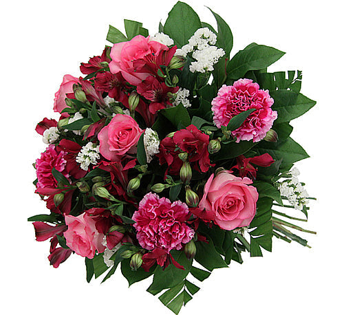Giving flowers is a warm gesture that shows them how much they mean to you... and this gorgeous hand-tied bouquet completely delivers! Featuring pink roses, deep red or burgundy Alstroemerias, delicate white flowering statice and lush greens all expertly florist-crafted. You may add a vase at checkout, or simply have these flowers delivered hand-tied for the recipient to place in their own container