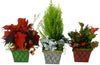 A trio of dish gardens to liven up the holiday season featuring poinsettia, christmas cactus and green plant.