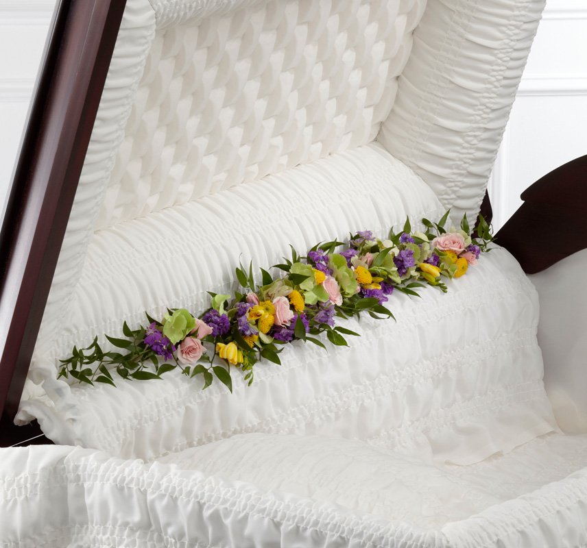 The Trail of Flowers™ Casket Adornment is a gorgeous accent piece that offers an extra touch of floral beauty at their memorial service. Green hydrangea, pink spray roses, yellow freesia, lavender larkspur and yellow button poms are arranged to bedeck the inner lining of the casket creating a soft and elegant look that perfectly commemorates the life of the deceased.