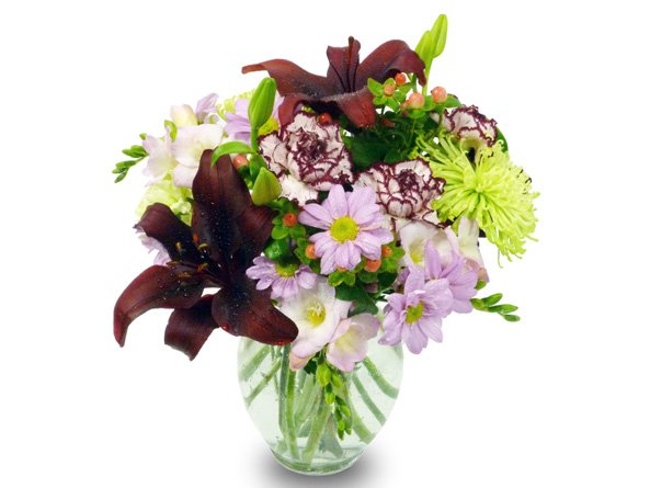 Warm Wishes contains Daisies, Anastasia, Carnations, Lilies, Berries, with filler and greens in a glass vase