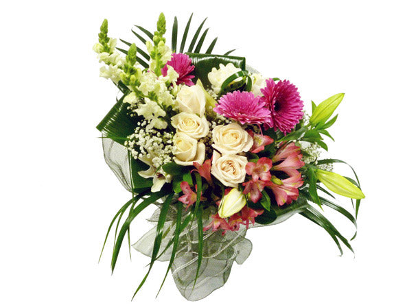 This classic bouquet consists of Roses, Gerberas, Alstromeria, Lilies, Snap Dragons, filler and an assortment of greens