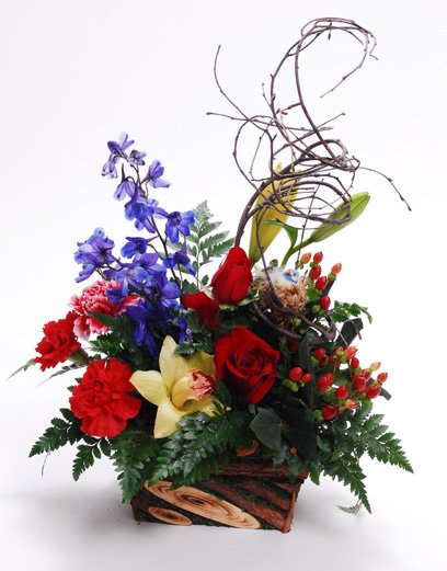 This beautiful basket features stunning Orchids, Lilies, Delphinium, Roses, Hypericum, Carnations and greens