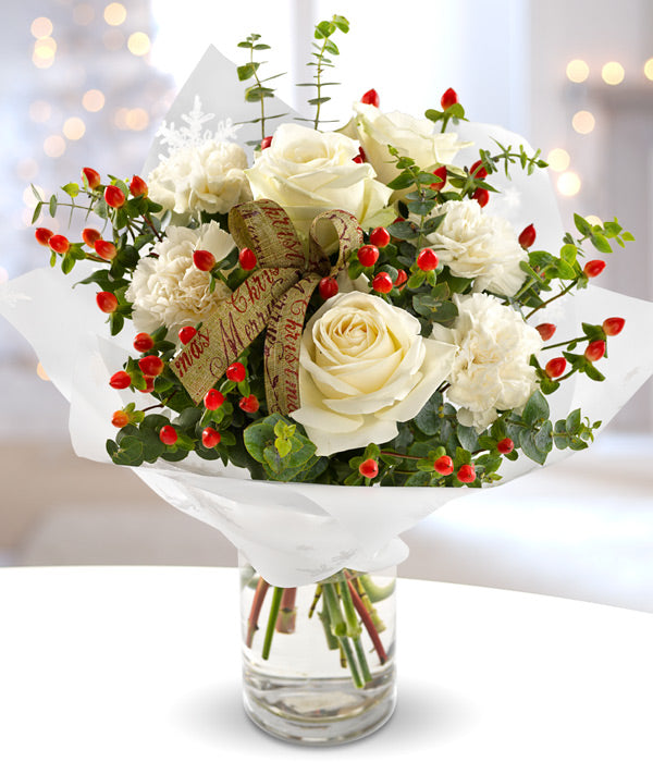 For a wintertime bouquet that's as pure as the driven snow, send this unexpected gift of white roses and carnations, accented with berries, and greenery. A simple pleasure for Christmas!