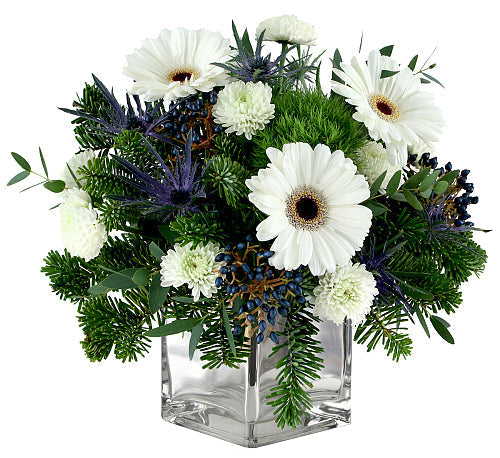 Let them experience their own Winter Wonderland with this stunning new design! Lush holiday greens, blue thistle, and glistening white blooms are a beautiful sight and will make them feel they are living in their own winter wonderland!